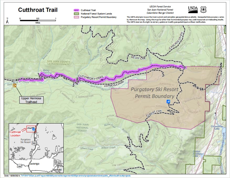 ( Runs parallel to Hermosa Park Road, connects Cascade Divide Road (Forest Service Road 579) and the Upper Hermosa Trailhead ) -
